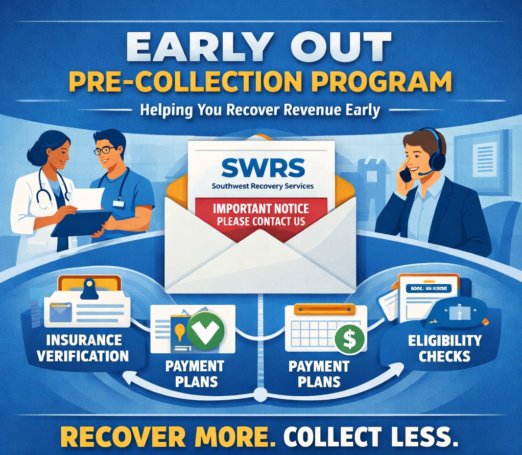 Health Care Organizations especially benefit from our Early Out Program, which is designed to identify additional insurance billing and to prompt patients to pay, thereby eliminating the need for extensive collection activity. Southwest Recovery Services (SWRS) uses letters to notify the patient that their account has been placed with Southwest Recovery Services and of their responsibility for the outstanding balance. Our letter demands payment in full for the balance owed or that the responsible party contact our office immediately.